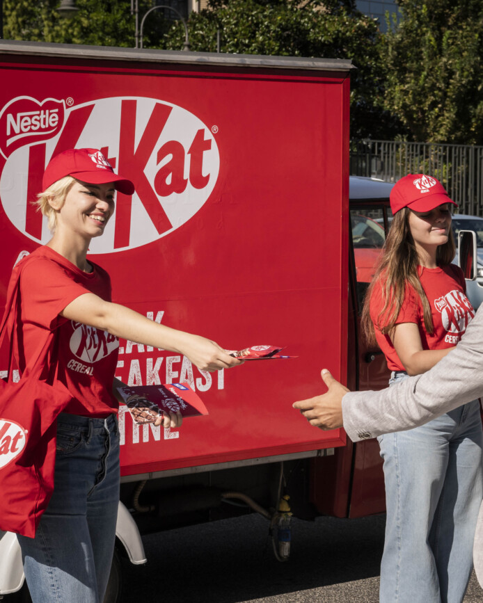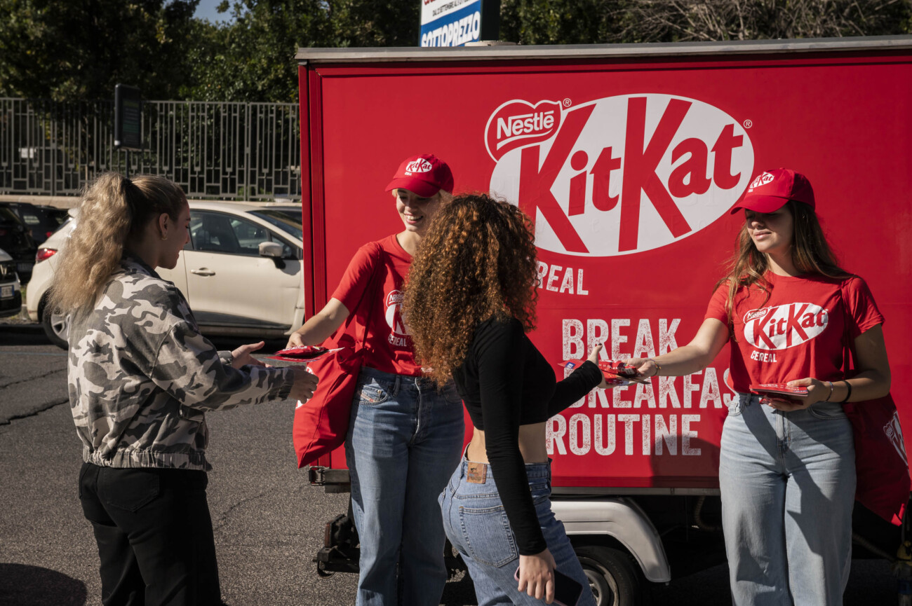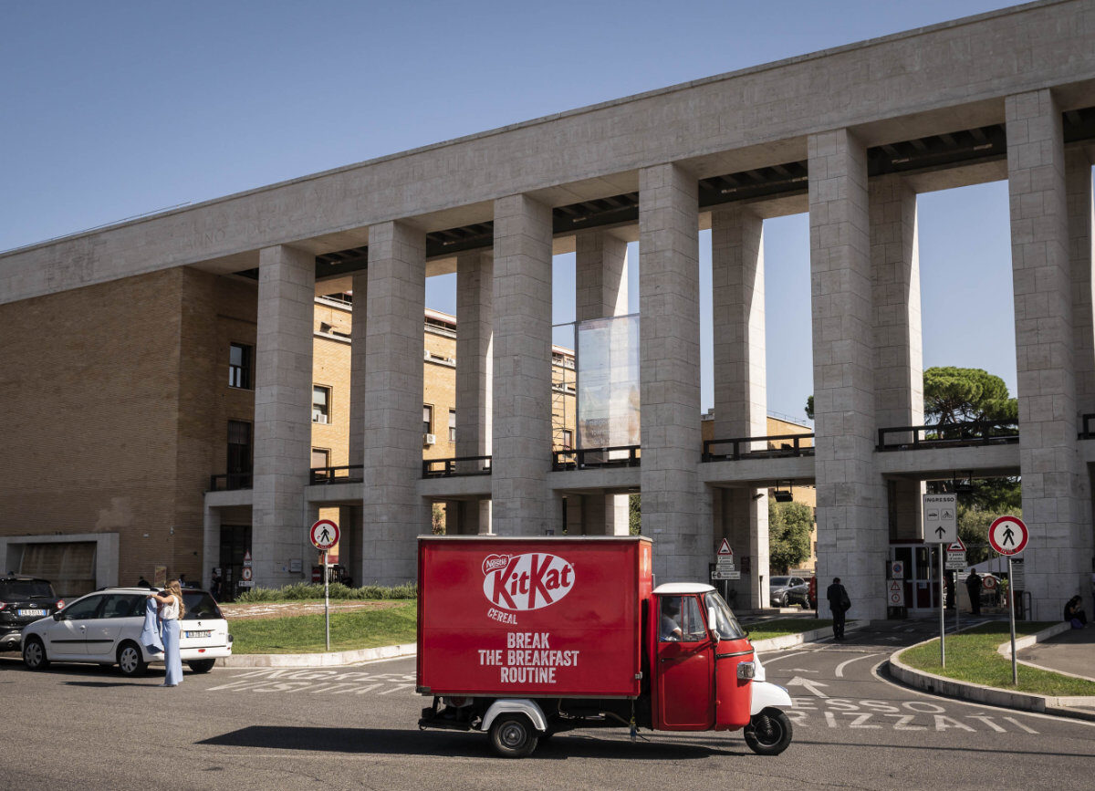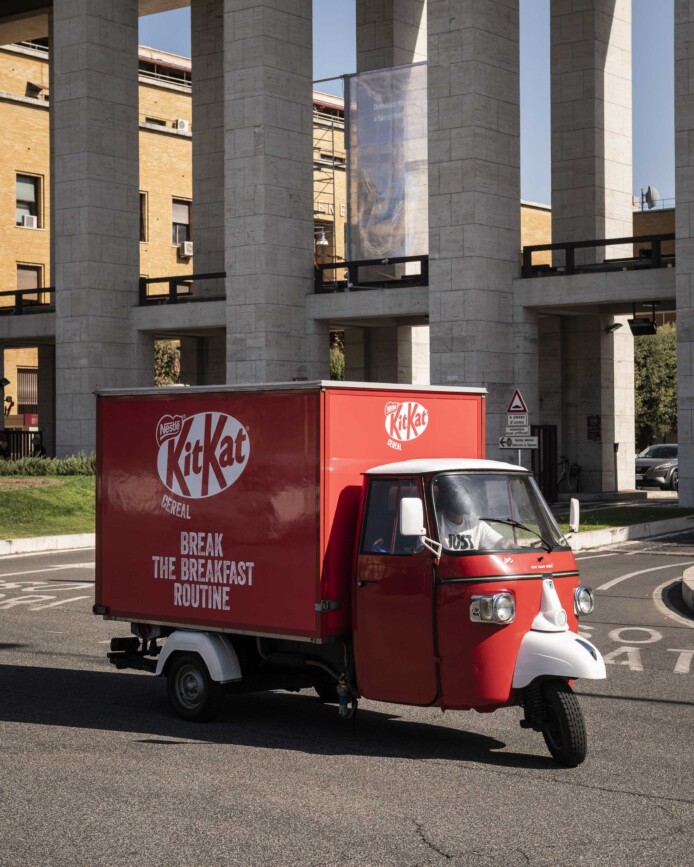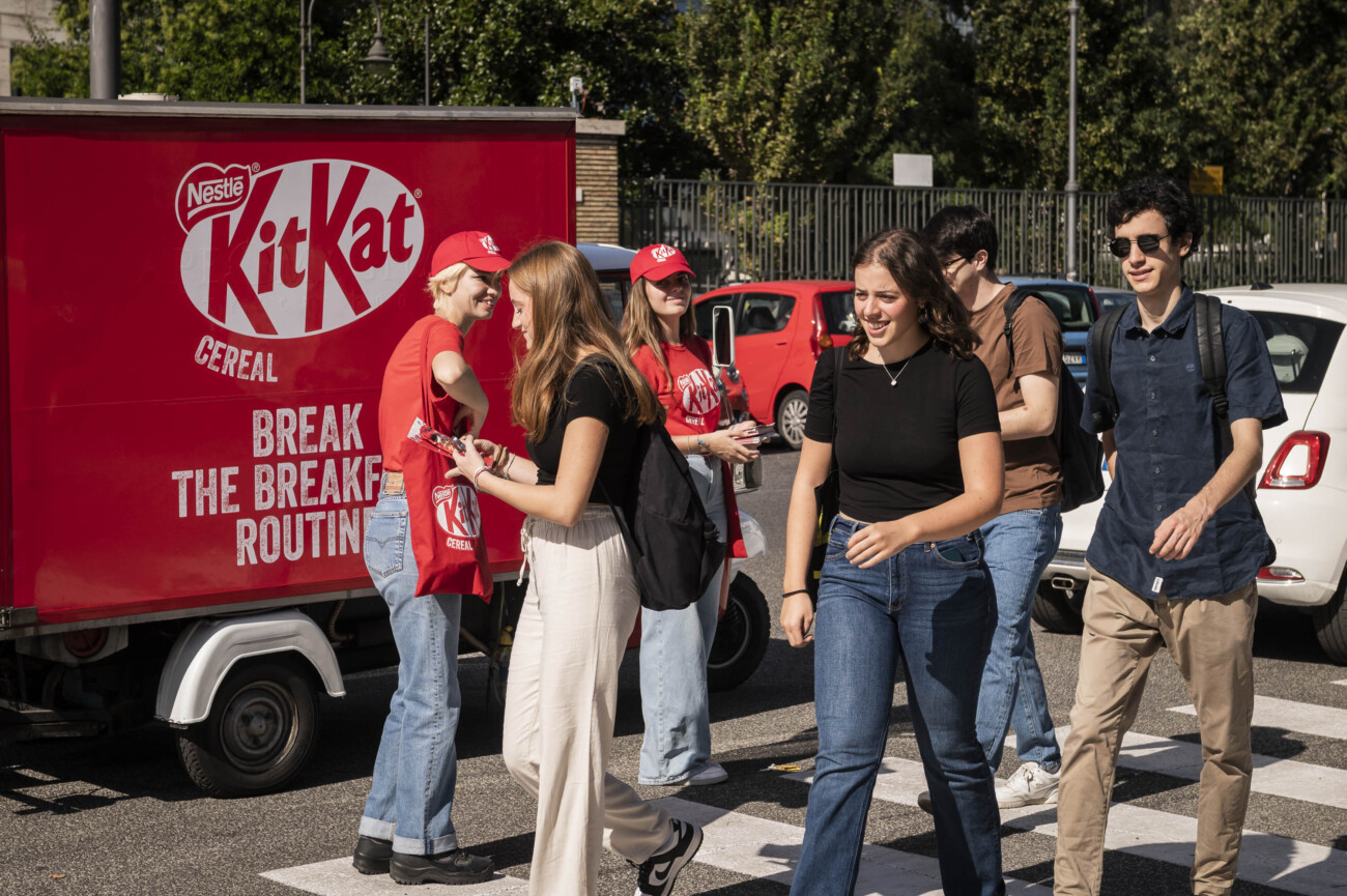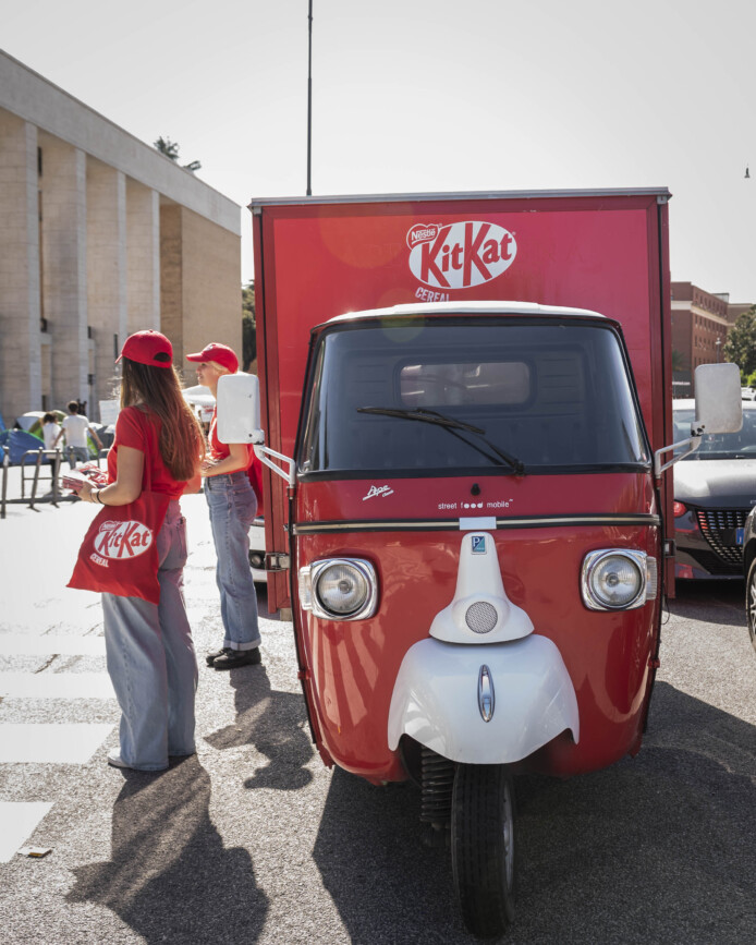 La nostra ApeCar brandizzata KitKat ha portato una ventata di energia e croccantezza davanti alle principali università di Roma e Milano, trasformando l’ingresso dei campus in un punto di incontro vivace e positivo.
